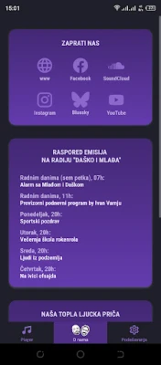 Zakoračite u svet audio-doživljaja koji budi vaš um i duh! Predstavljamo vam jedinstvenu zbirku programa okupljenih oko kultnog "Alarma sa Daškom i Mlađom", emisije koju njeni autori s ponosom nazivaju drugim najboljim jutarnjim programom bivše Jugoslavije. Pripremite se za neponovljivu energiju, britke komentare i prepoznatljiv humor koji vas svakog radnog dana, osim petkom, od 7 do 10 časova, vodi kroz dan. Ovo je vaša doza autentičnosti, iskrenosti i sjajne zabave koja nadilazi uobičajene formate, donoseći vam jedinstven pogled na svet.
