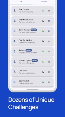 Zaronite u bogatu kolekciju jedinstvenih igara koje temeljno angažuju vaš mozak. Testirajte sirovu brzinu reakcije uz kultni izazov "F1 Start Lights", gde je ključno tapnuti u trenutku gašenja svetala, što je vrhunska vežba za čistu brzinu. Ili se prepustite igri "Swipes" za poboljšanje koordinacije oko-ruka i brzine odlučivanja, dok "Color Choice" proverava vašu procesnu brzinu kroz efekat inspirisan Stropovim testom. Od pronalaženja uljeza u "Odd One Out" do praćenja mete u "Moving Ball", svaka aktivnost u Reaction Time: Reflex Testu nudi specifičan benefit za vašu mentalnu agilnost, uključujući i dodatne zagonetke poput "Four Corners" i "Target Blink Maze".