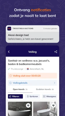 Aplikacija Troostwijk Veilingen pruža vam kompletan pregled svih aukcija na dlanu. Istražujte, pretražujte i pratite hiljade dostupnih kavala sa lakoćom, u bilo kom trenutku. Licitirajte direktno sa svog mobilnog uređaja i budite u toku sa svakom promenom. Naša pametna push obaveštenja osiguravaju da ste odmah obavešteni kada je neko nadmašio vašu ponudu, dajući vam priliku da brzo reagujete i održite svoju poziciju. Uživajte u seamless iskustvu aukcija, gde god da se nalazite. Želimo vam uspešne licitacije!
